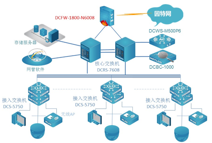 架构高速稳定:核心采用两台7608E交换机顺利获得VSF方式实现冗余热备,使网络不仅具有高速吞吐率,网络核心采用双核心架构同时保障网络的稳定性。