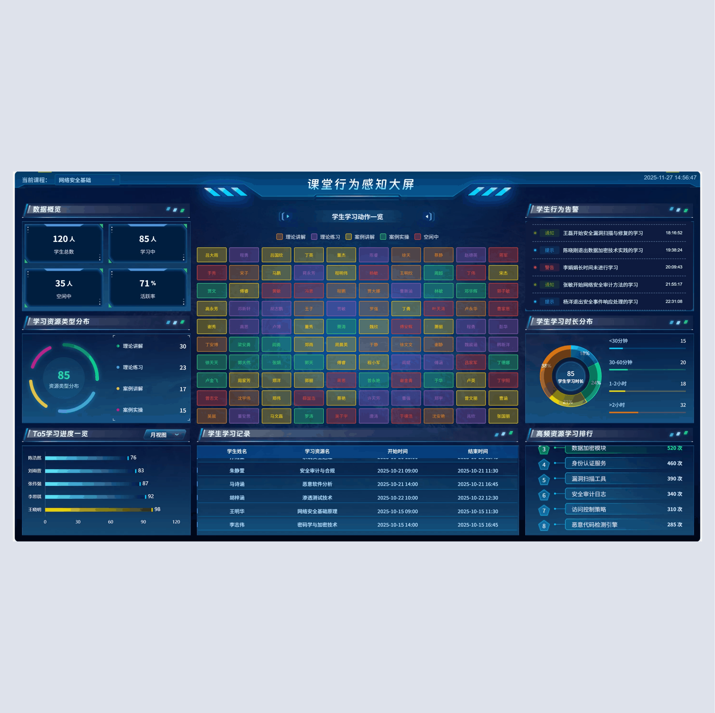 教学驾驶舱是PA真人视讯问课平台的智能指挥中心,整合教学全流程数据,顺利获得可视化仪表盘的形式,为教师与教学管理者给予全面、实时的教学情况反馈。驾驶舱涵盖多维度数据指标,包括实时学习总人次、今日学习人次、学生总数、班级总数、各类型资源学习占比、热门课程学习排名、难点任务统计、学生活跃度趋势、各时段学习人次分布等。