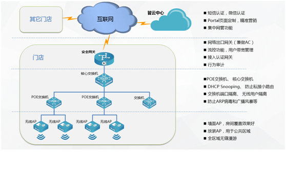 面对移动互联网大潮对传统行业的冲击,运用云计算、移动社交、大数据分析等技术,为酒店、餐饮、休闲娱乐、零售商超等商业市场客户构建基础网络平台,加速商业市场客户业务创新和转型已经刻不容缓,PA真人视讯智云商业解决方案志在为商业客户给予最强的用户体验,给予最具商业价值的云网络,给予基于portal认证,短信、微信营销功能。